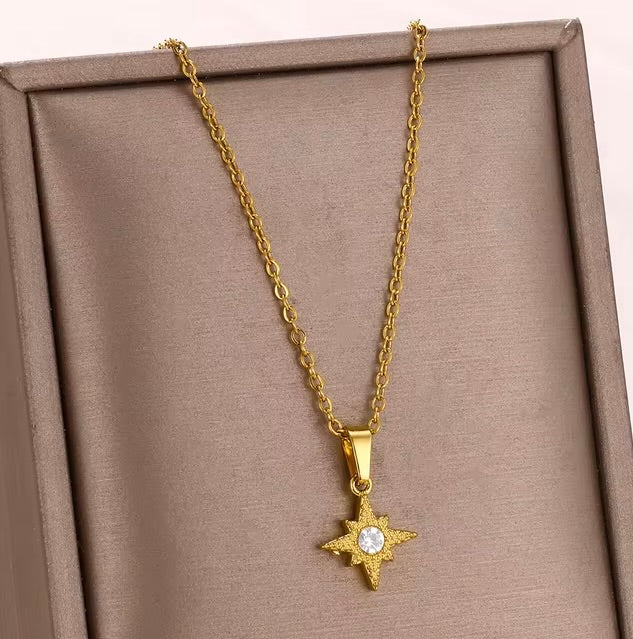 The Astra necklace features a star-shaped pendant crafted from stainless steel, symbolizing cosmic beauty. A central crystal adds a sparkling accent, enhancing its celestial design. Paired with a refined chain, this piece is both timeless and luminous, perfect for elevating any style.