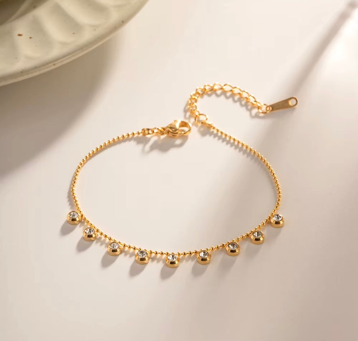 Discover the elegance of the Bliss, a stunning piece crafted from high-quality stainless steel. Featuring a delicate chain adorned with gleaming gold-tone beads, this bracelet radiates sophistication and charm. Designed with an adjustable clasp, it ensures a perfect fit for any wrist size.