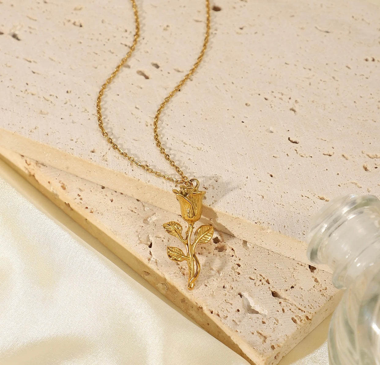 The Bloom necklace is a stunning piece crafted from stainless steel, featuring a beautifully detailed rose pendant that symbolizes love and elegance. Its minimalist yet graceful design makes it a timeless accessory suitable for any outfit or occasion.